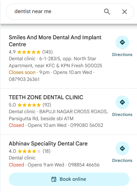Local results ( like “pet clinic in secunderabad” or “dentist in kondapur”)